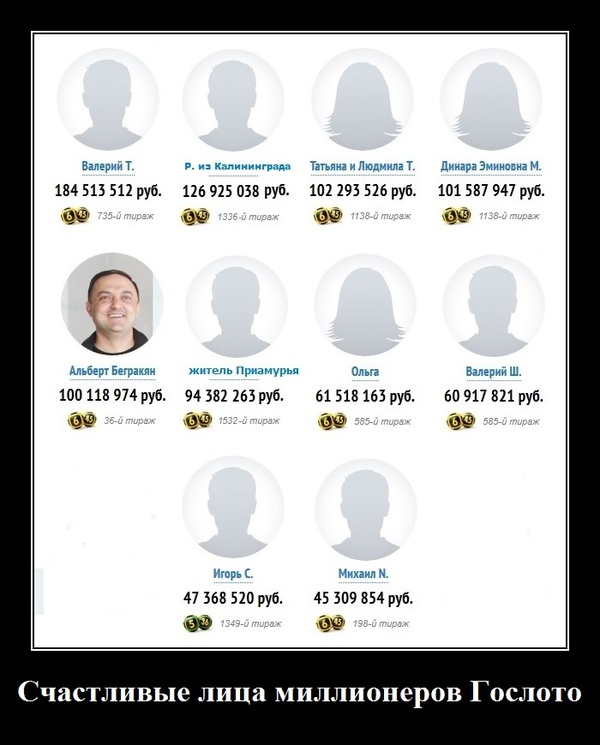 Что общего у всех многомиллионных победителей лотерей Гослото? Правильно – их никто никогда не видел! Организаторы даже не утруждают себя публикацией фотографий счастливых победителей хотя бы в маске (как это делают некоторые мировые лотереи в случае отказа новоявленного счастливчика показать себя). Вместо этого нам каждый раз рассказывают историю про неизвестного, который дает короткое интервью и – исчезает в небытие. Навсегда!