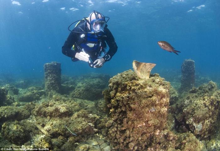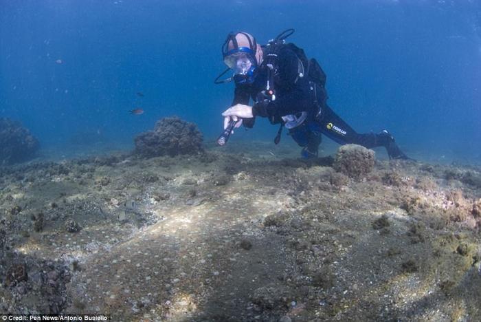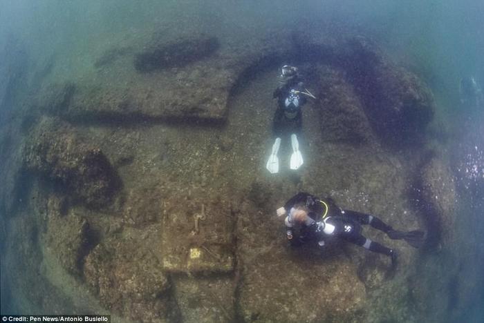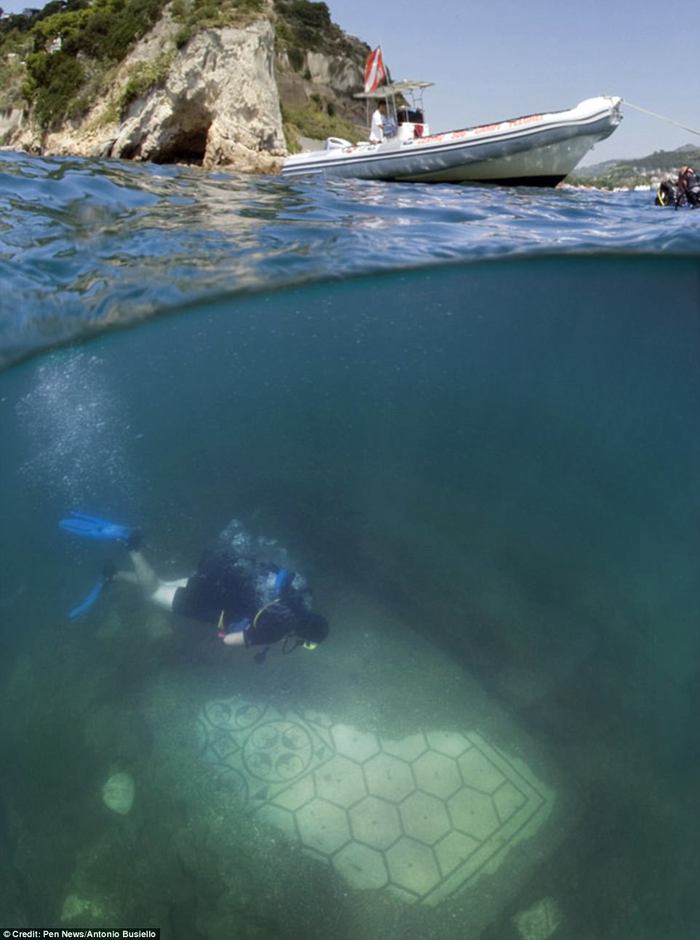 Невероятно, но часть строений и архитектурных украшений города все еще сохранилось 1700 лет спустя. На снимке ниже, водолаз показывает мозаичный пол внутри разрушенного здания.