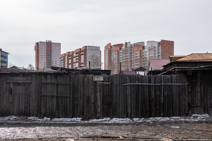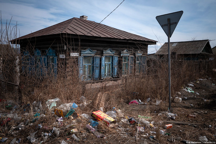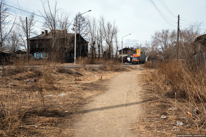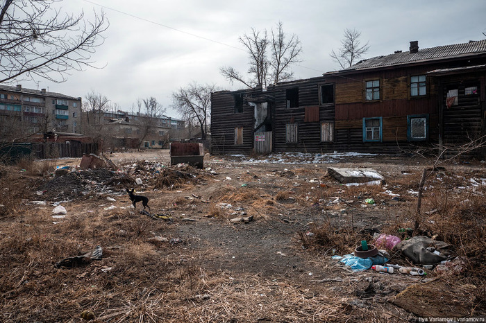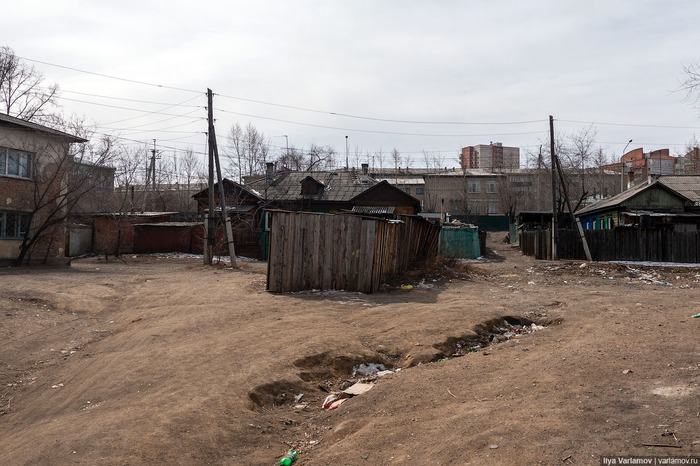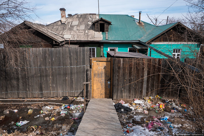 Один из дворов. Многие бараки уже сгнили, развалились, но в них продолжают жить люди. Совершенно нормальная ситуация для Читы, когда половина дома развалена, а в другой живут семьи.
