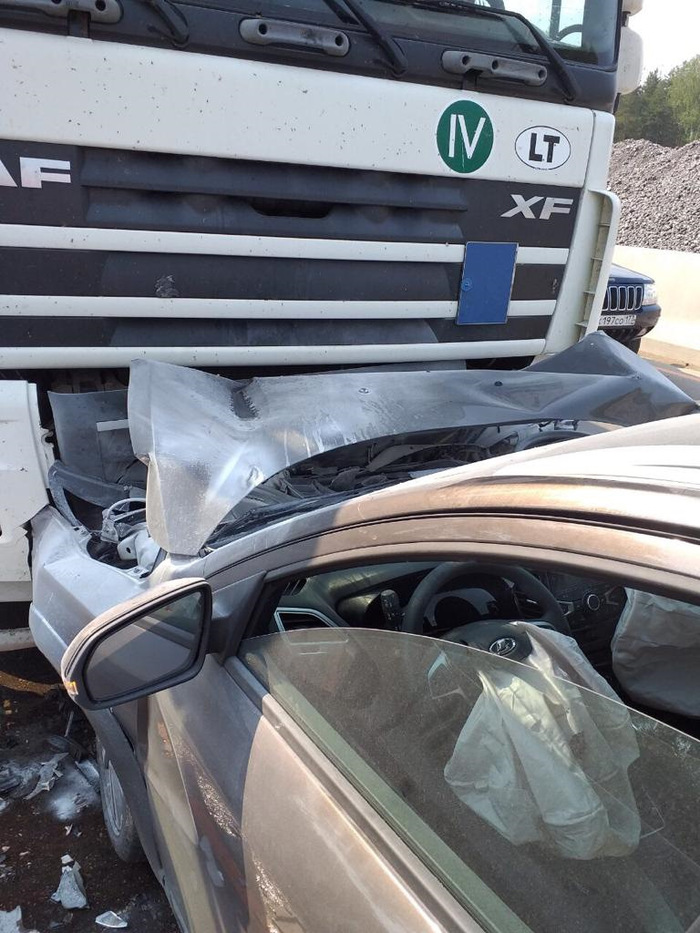 Авария произошла на трассе А-107. Из встречного потока из пробки выехала Лада Веста и на полном ходу, хорошо не сильно разогнаться успел, врезалась в лоб фуре…