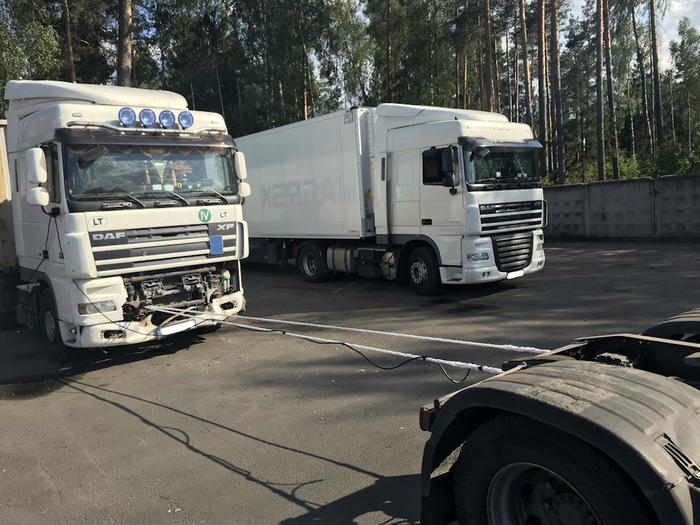 В тот же вторник, после осмотра мы отбуксировали своим вторым тягачом поврежденную фуру в сервис. Там ребята молодцы, на следующий день в среду привезли новый радиатор (обошлось малой кровью) и кое-что по мелочи, работали до глубокой ночи, починили (около 60 тыс. руб.), выдали все чеки и документы о ремонте и уже рано утром в четверг обе машины уехали в сторону дома.