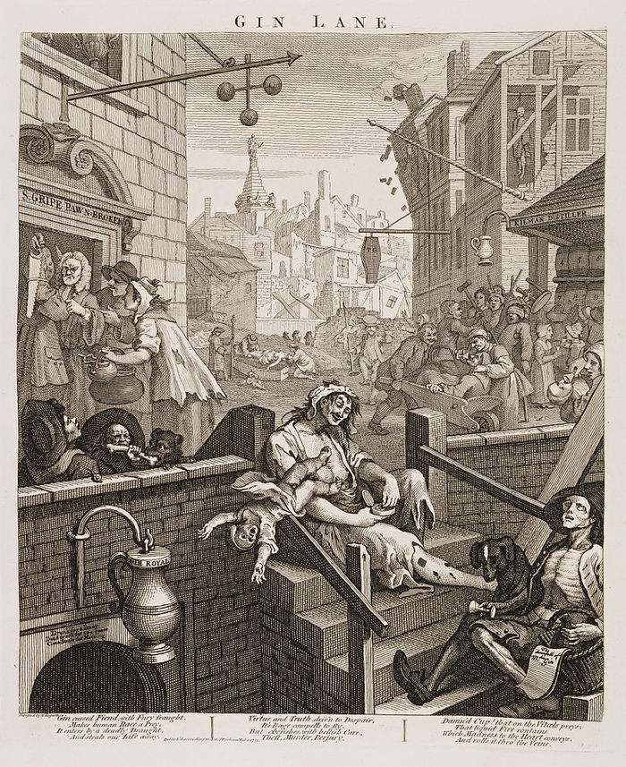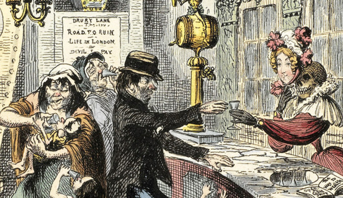 В XVIII веке бухло чуть не погубило Лондон и всю Англию. Дешевый, почти бесплатный джин лился рекой, затопив городское дно. Люди бегали по улице голыми, матери убивали собственных детей за пинту, а уровень убийств был как на войне.