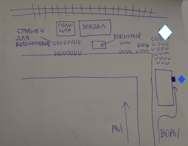 Что ж, на третий день мы, уже почти отчаявшись, снова пошли на вокзал. Ничего интересного не обнаружив, решили сходить в старый центр города, что неподалеку. Я шла уже не оборачиваясь, как вдруг заметила, что мой товарищ очень сильно отстал от меня, засмотревшись на кого-то. Он увидел чернокожего человека, едущего на похожем на наш велосипеде, но как-будто покрашенного сверху розовой аэрозольной краской. Вот это поворот. Мы побежали за ним, чтоб увидеть, где он остановится, но внезапно мой друг увидел на другой стороне дороги двоих человек, едущих на наших небесно-голубых велосипедах! Мой друг крикнул мне, чтоб я снимала их на видео, но они скрылись за зданием. Я пыталась снять что-нибудь на бегу, подходя к вокзалу. На рисунке примерно обозначено что/где. Белый ромбик - где остановился мой друг, синий - воры. В общем, я побежала за полицией!