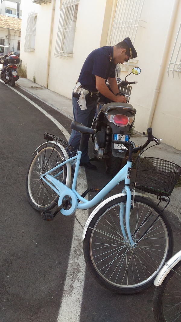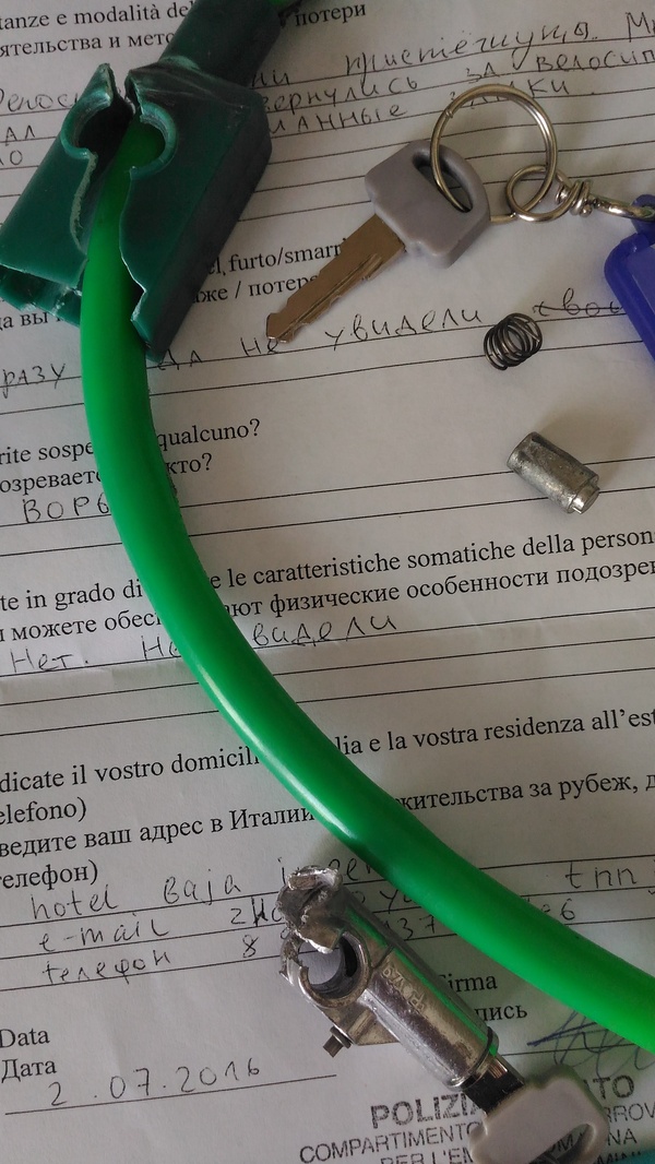 Дальше была рутина в участке, где мы очень долго просидели. Документы все были написаны на итальянском, а не на английском, нам только худо-бедно перевели, что там. Естественно, написано в них было как будто мы просто нашли припаркованные велосипеды рядом с вокзалом. О подонках - ни слова. Копий того, что мы подписывали - не дали, хотя я просила. Поэтому я сфтографировала одну из бумаг(потом сел аккмулятор в телефоне)