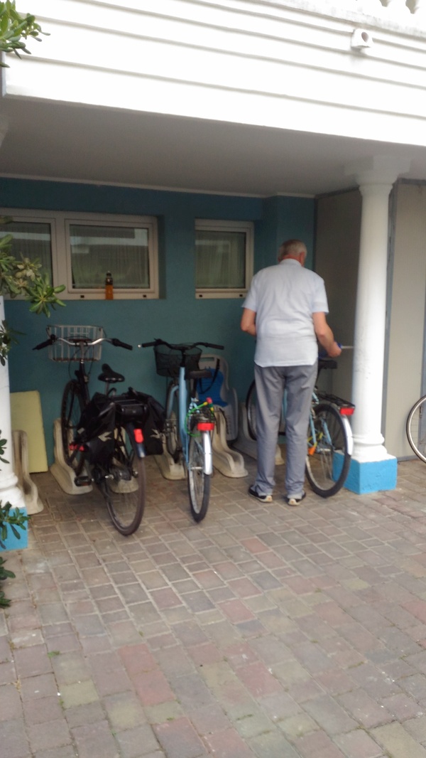 В отеле можно было хоть каждый день брать велосипеды и кататься по городу, но нам удалось это сделать только на 4 день пребывания в Италии. Всего 6 велосипедов, пристегнутые очень слабыми замками. Но мы пока о свойствах замков ничего не знали, т.к. у нас в России их нет.