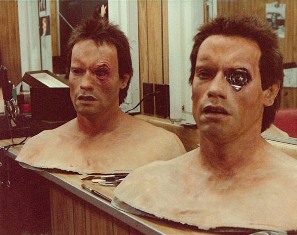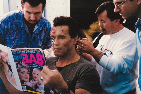 В гримерной на съемках второго "Терминатора" я не забывал о реальной жизни – нашей дочери Кэтрин только что исполнился год, и вот-вот должен был появиться на свет второй ребенок (обратите внимание на журнал, который читает Арни во время нанесения грима)