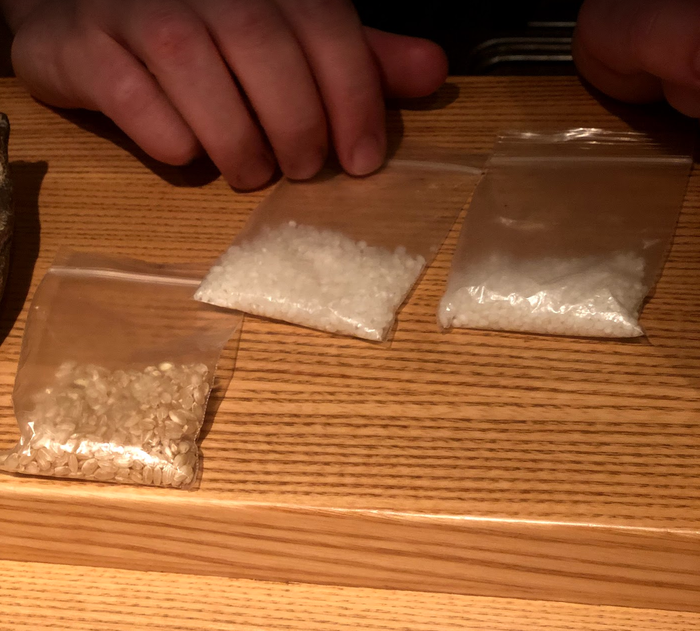 При этом, подача была такой, что ты понимал о чем напиток, до того как выпил его. Например, в металлической гладкой посудине — саке по рецепту из 1600х, с нотами клубники и на основе сильно шлифованного риса. В центре — саке с пузырьками, типа шампанского, поэтому и сосуд весь в мелких пузырьках. И справа — грубое, рубящее саке в грубой маленькой чашулине, шероховатой, будто она сделана из песка.