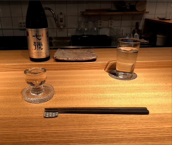 Второй повар тут же достал бутылку саке, рюмку (о-тёко) и подставку под нее. Он аккуратно налил напиток до краев, потом хитро посмотрел на меня и сказал: “Первая должна быть налита через край”. И продолжил наливать, пока подставка под рюмкой не заполнилась.