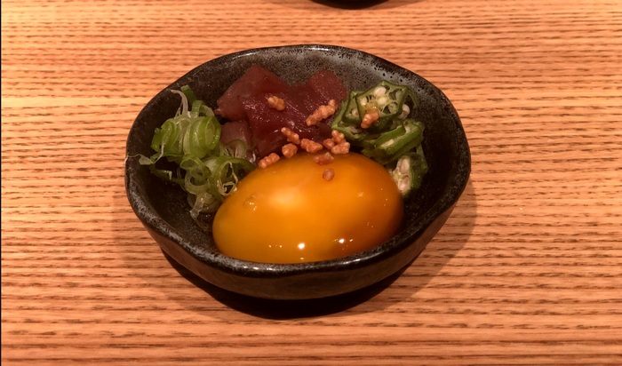 Зеленый лук — знаю. Тунец — знаю. Жареный какой-то особый рис — ну догадываюсь. Желток, каким-то магическим образом НАГРЕТЫЙ в соевом соусе, — возможно знаю (хотя, как он держит эту консистенцию, не ясно). Окра . Чееееее? Гуглю. Абельмош съедобный. Что же это за хрень, которую тут все знают, словно это огурец? Я перестал узнавать и рыбу, и растения. Все составляющие блюда, по идее повара, нужно было смешать и потом выпить как “шот”.