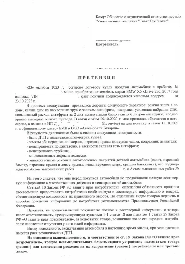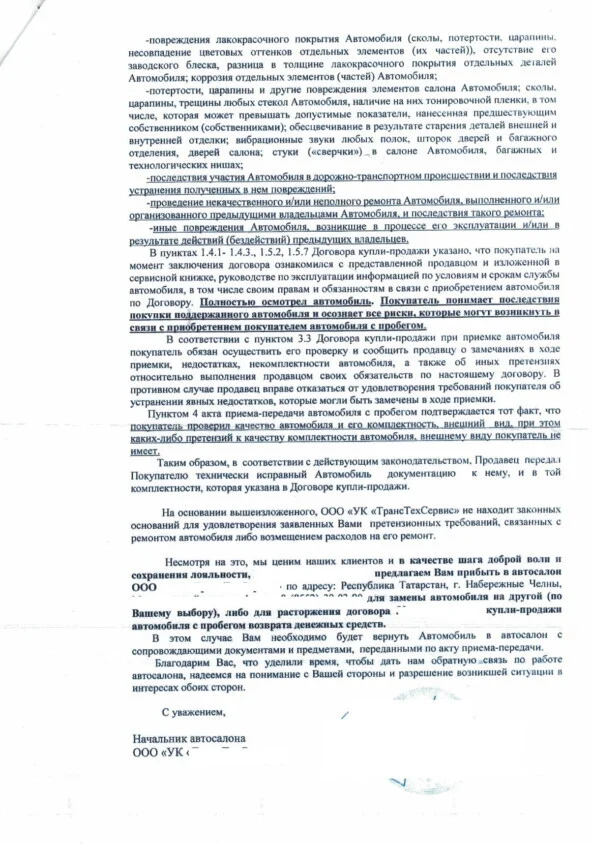 Ответ продавца был предсказуем, как утро понедельника: «Автомобиль был передан в исправном состоянии. Покупатель имел полную возможность его осмотреть. Все риски по договору купли-продажи б/у автомобиля лежат на Потребителе. В претензии отказать».
