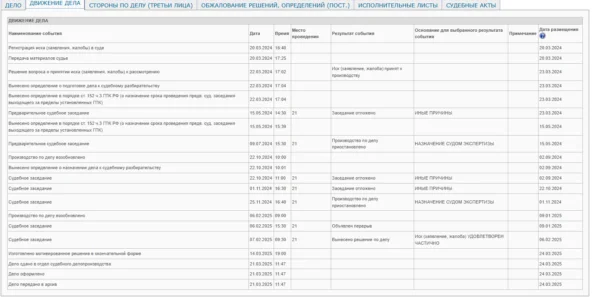 Иск подали 20.03.2024, а окончательное решение получили почти год спустя — 14.03.2025. Было проведено 7 заседаний и 2 экспертизы. Дело было сложным.