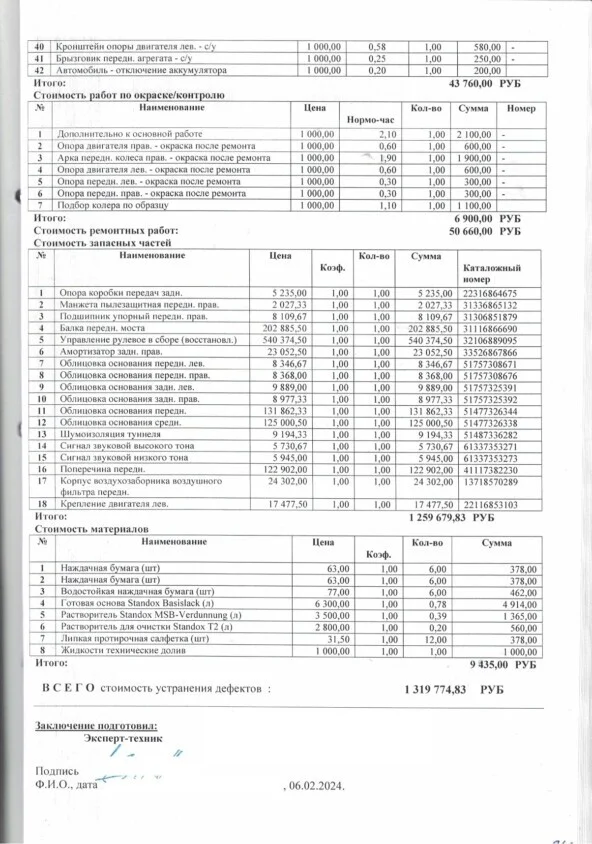 Эксперт осмотрел автомобиль и вынес вердикт: стоимость устранения недостатков обойдется в 1 319 774 рубля 83 копейки.