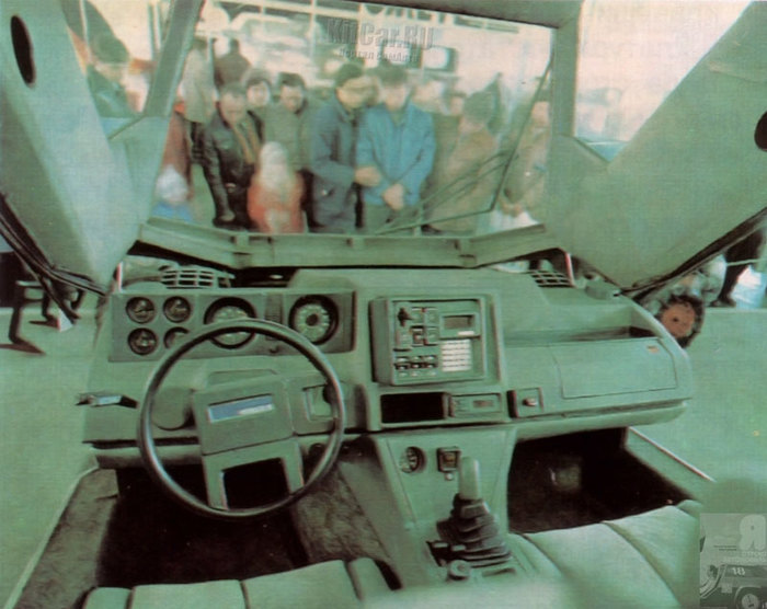 Зеркало заднего вида располагалось под небольшим обтекателем на крыше автомобиля. Чтобы пользоваться им, в крышу, над водительским сиденьем, было вмонтировано окошко. Кстати, сиденья для машины были изготовлены в виде самолетных кресел с очень высокими спинками. Говорят, в них было очень удобно сидеть. Для улучшения обзора назад Александр смонтировал камеру заднего вида, и это в то время, когда в СССР автомобили, сходившие с конвейера, еще не комплектовались правыми боковыми зеркалами. Мощно освещать дорогу в темное время суток были призваны четыре фары, которые выдвигались по центру капота с помощью электропривода. Это было очень необычно и эффектно, а также улучшало аэродинамику автомобиля, когда фары не нужны. Задний обзор водителю обеспечивал перископ