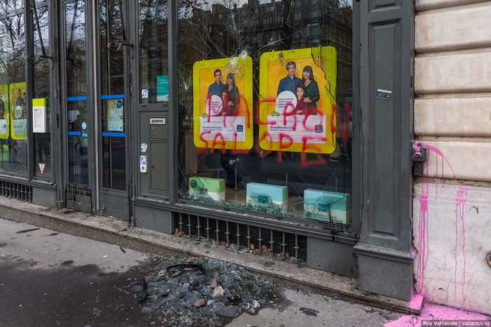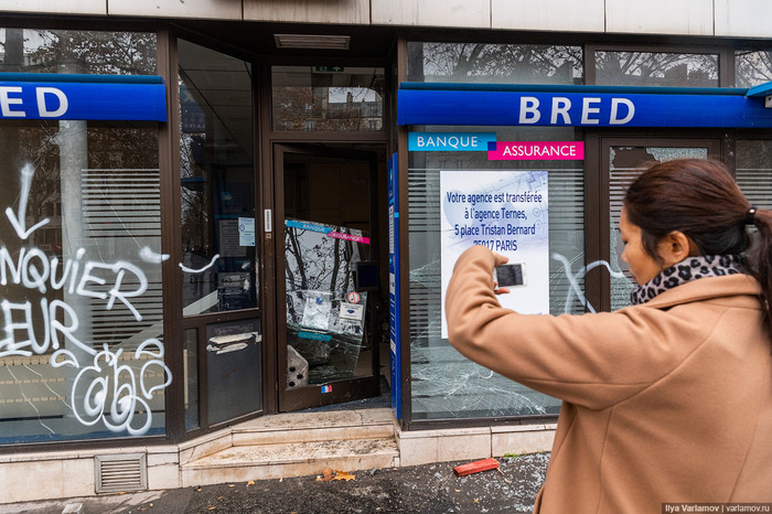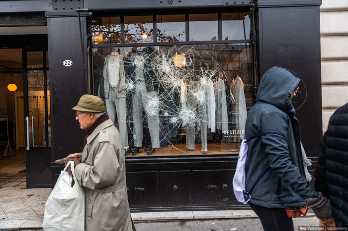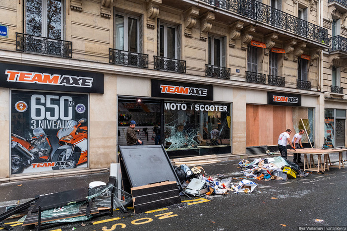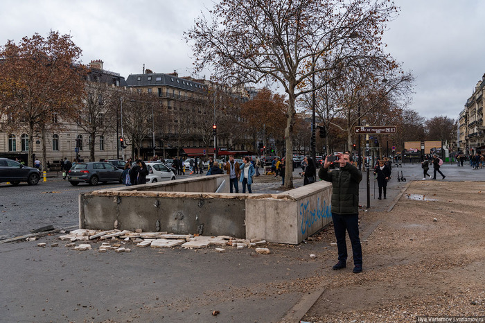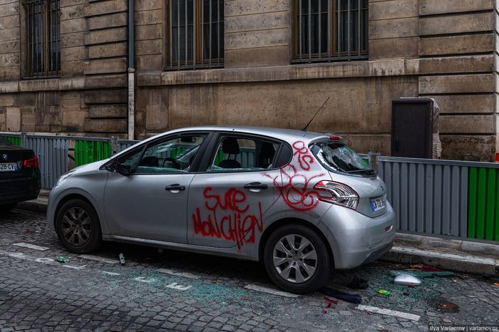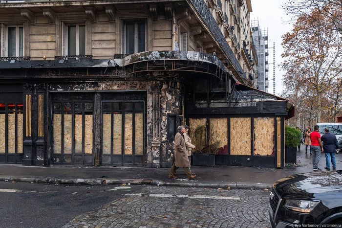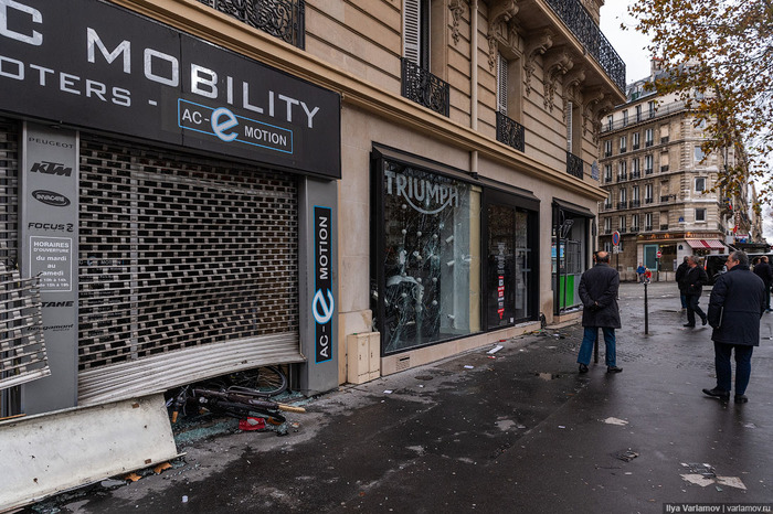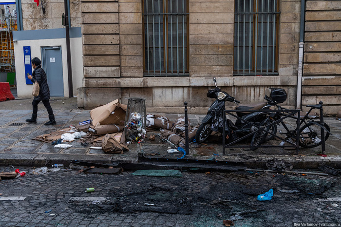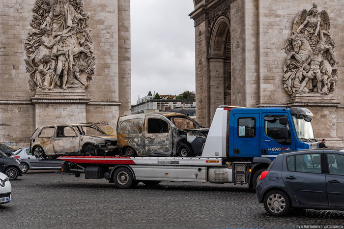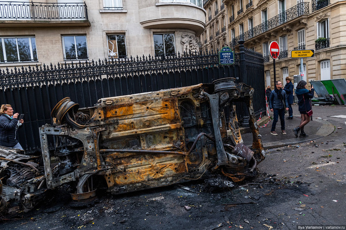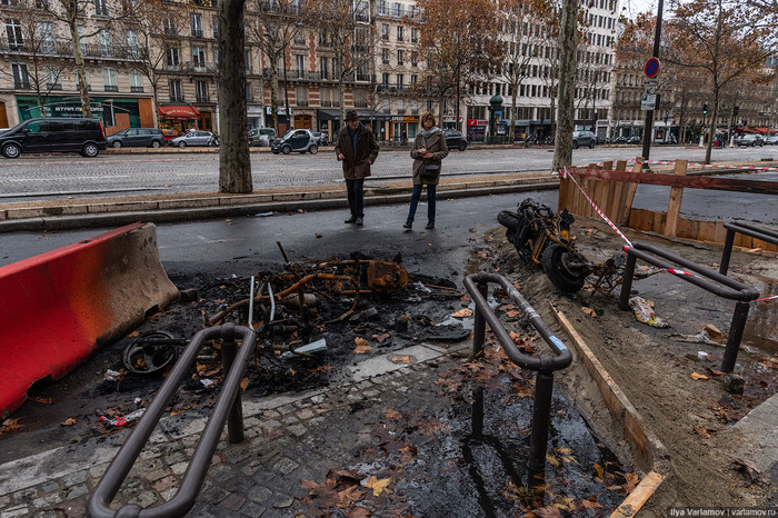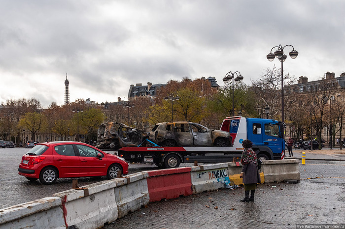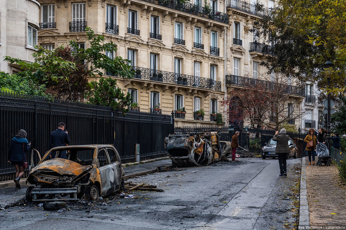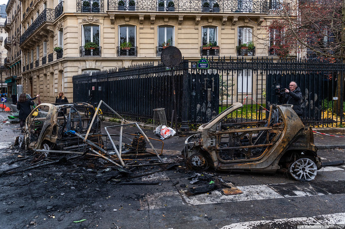 Я вышел утром из отеля и пошёл в сторону Триумфальной арки, где накануне до поздней ночи были беспорядки. Баррикады и завалы на дорогах убрали и движение уже открыли, но тротуары привести в порядок ещё не успели. Хорошо одетые французы тихо ходили между сгоревших машин и фотографировали разбитые витрины.