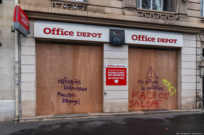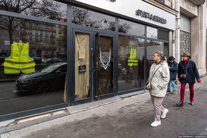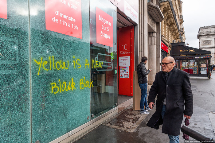 Некоторые вывешивали в витринах жёлтые жилеты в знак поддержки протестующих. И это работало: такие витрины не били.