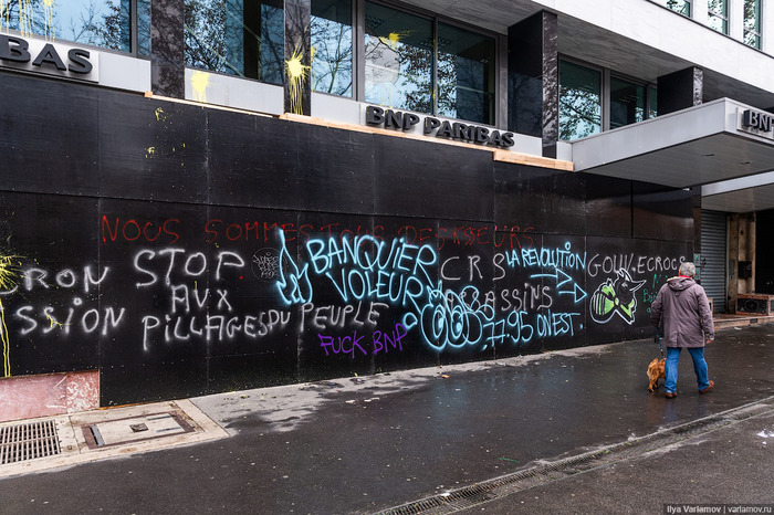 Этому ресторану не повезло: рядом с ним подожгли машины, и от огня обуглился фасад. Вообще, рестораны и частные магазины не трогали. Били в основном банки и крупные торговые сети. Во время погромов было интересно наблюдать, как какой-нибудь "Макдоналдс" или "Старбакс" срочно закрывается, а рядом работает шаурмичная, в которую стоит очередь. Или как "Карфур" (местная "Пятёрочка") забивает свои витрины, но лавка простого француза, где продают продукты, работает без проблем, и никто её не тронет. Агрессия и погромы были очень избирательными, за исключением, конечно, некоторых случаев, как с музеем в Триумфальной арке.