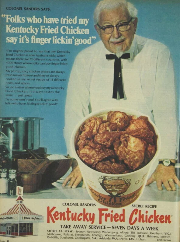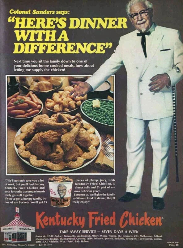 Но Сандерс не сломался. Он переключился на местных. В 1942 он замутил свою первую поваренку, это такой типа рекламный листок с рецептами, который он вручал гостям и пиарил свое кафе. То есть он не просто кормил народ, а начал грузить их своими фишками. Этот ход раскрутил его по району, и помог вытянуть бизнес с того света.