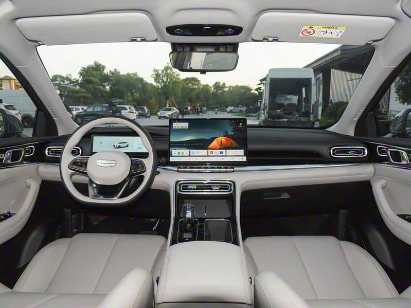 Новый Emgrand доступен с тремя вариантами отделки интерьера. Помимо привычных черного и серого цветов, предлагается и коричневый. Автомобиль получил цифровую панель приборов и медиасистему с экраном диагональю 14,6 дюйма под управлением Flyme Auto. Автомобиль сохранил физические кнопки управления основными функциями и получил 50-ваттную беспроводную зарядку с охлаждением.