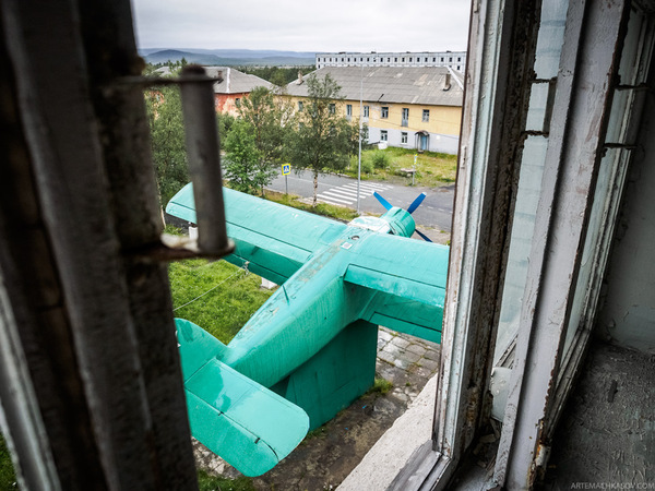 Через пустую глазницу окна, обрамленную рассохшейся рамой с облупившейся краской виден старый самолет, покрашенный зеленой краской.
