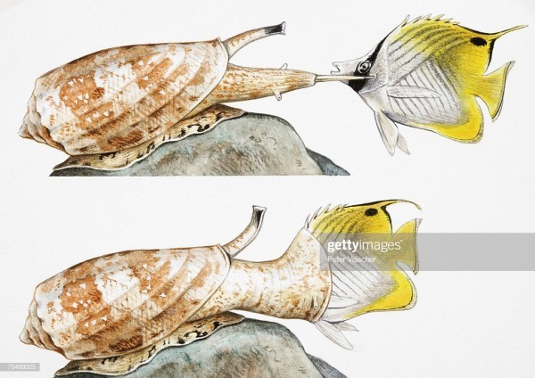 Язык у Conus geographicus работает как гарпун -выстреливает такая длинная лента с ядовитым крюком - зубом на конце.