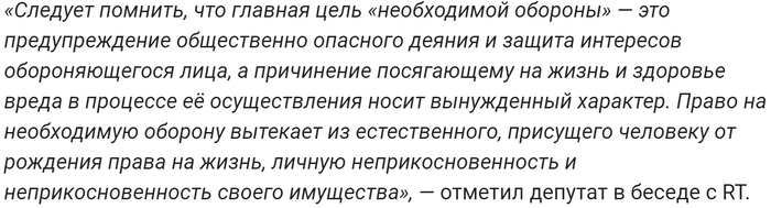 По словам парламентария, принятие данного проекта будет способствовать большей защищённости граждан и их уверенности в том, что любые действия, направленные на защиту самого себя и своей семьи, будут законными и правомерными.