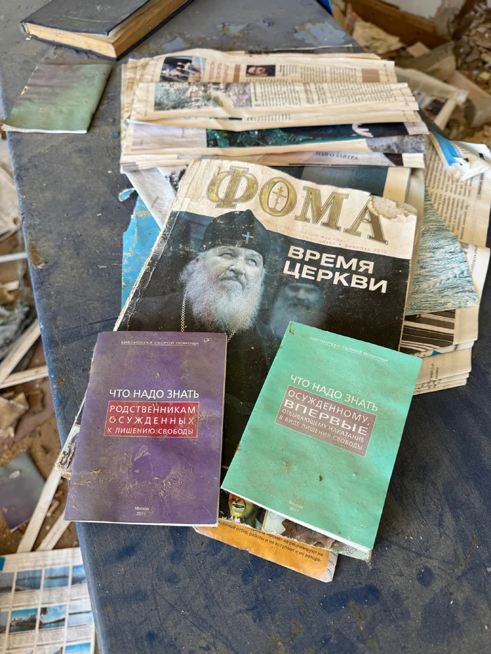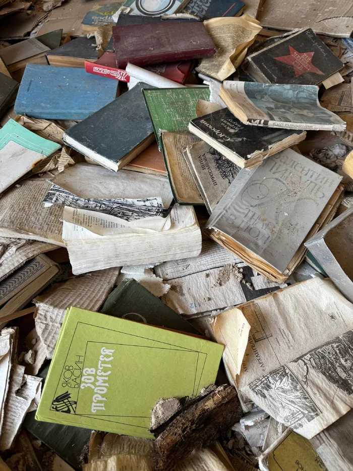 Внутри осталось множество пустых коробок с логотипом «Почты России» и несколько книг, намекающих на наличие здесь неплохой библиотеки.